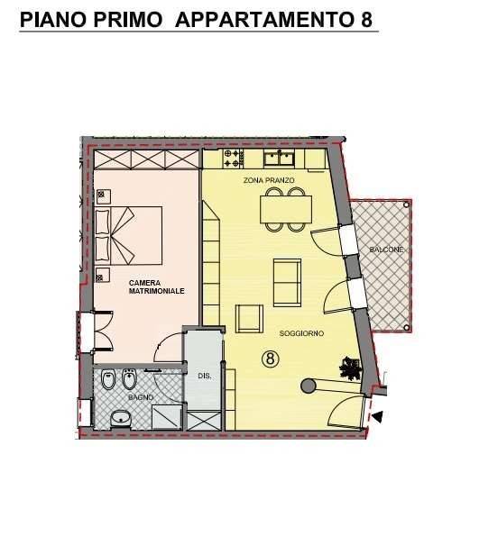 2 LOCALI CON CANTINA - appartamento al primo piano così composto: ingresso, ampio soggiorno con cucina a vista, balcone, disimpegno notte con attacchi lavatrice, bagno finestrato, ampia camera matrimoniale. Possibilità box.