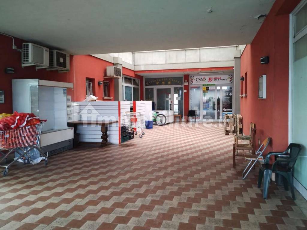 L'immobile è stato edificato con struttura in conglomerato cementizio armato, con una maglia di pilastri e travi oltre a solai, presumibilmente in latero-cemento. La copertura del fabbricato è con tetto a falde in tegole in laterizio. Le due unità presentano vetrine che affacciano sul porticato coperto e hanno una struttura in metallo. La pavimentazione è in piastrelle di ceramica e/o gres, mentre i serramenti sono in alluminio verniciato. Le porte interne sono il legno. Inoltre, sono presenti servizi tra cui quello per diversamente abili, spogliatoi e bagni addetti. Gli immobili si presentano in sufficiente stato manutentivo. Complessivamente l'unità misura circa 493 mq, compresi i tre posti auto siti al piano terra, che risultano di 10 mq l'uno.