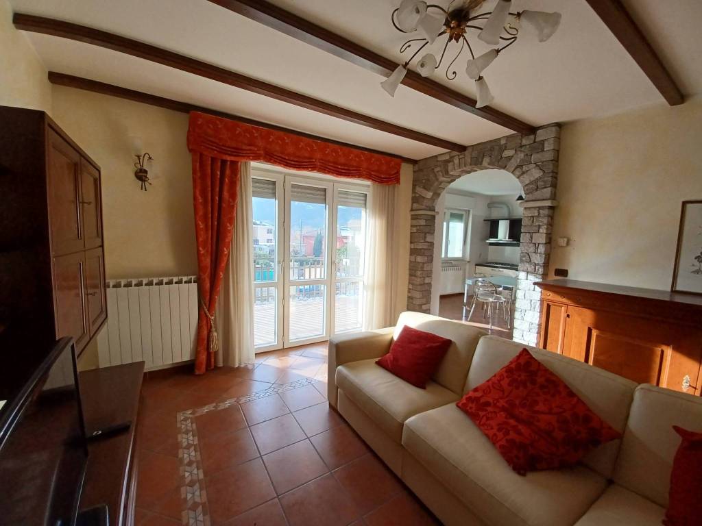 In piccola palazzina, luminoso appartamento al primo piano composto da ingresso su ampio soggiorno, cucina abitabile, 2 camere, bagno, terrazzo e balcone. Con box auto e cantina. Possibilità di acquistare l'arredamento presente e un secondo box auto di ca 26 mq.