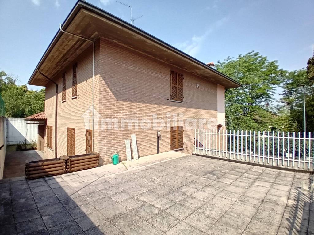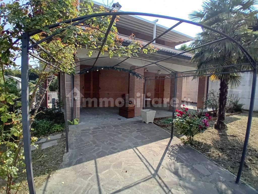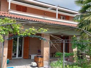 In posizione tranquilla, in Strada privata a fondo chiuso, villa singola costruita nel 2000, con interventi per l'isolamento termico, sostituzione impianti di climatizzazione invernale, sostituzione infissi, schermature solari e chiusure oscuranti e fotovoltaico, effettuati nel 2023, composta da ampio soggiorno e cucina abitabile con uscite sul porticato, bagno e camera al piano terra. Ampio disimpegno , cabina armadio, 1 bagno, ripostiglio, camera e 2 camere matrimoniali con uscite sull'ampio terrazzo attrezzato con tenda da sole, al piano primo. Al piano seminterrato cantina, centrale termica, taverna e box doppio con sovrastante terrazzo. Giardino e cortile sui 4 lati e posti auto privati.