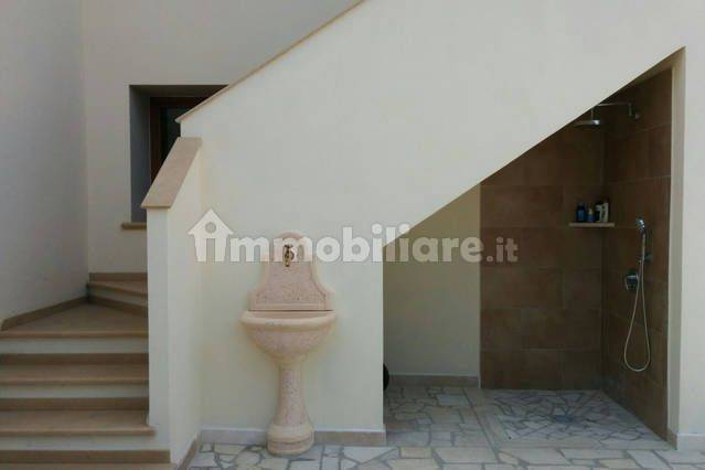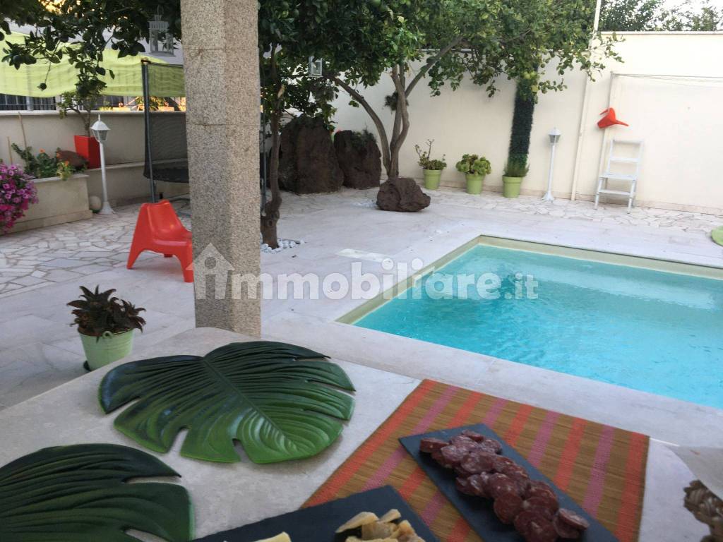 Il giardino interno, impreziosito da marmi di pregio locali e da un gazebo e’ dotato di illuminazione, piscina riscaldata con idromassaggio, locale tecnico e doccia esterna. Sono presenti alberi tipici del mediterraneo, come gli alberi da frutta (arance e limoni) e un albero di olivo secolare.