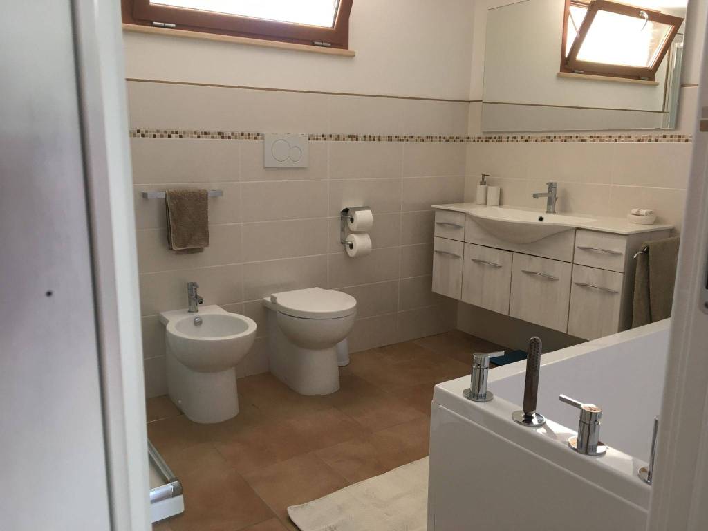 L'ppartamento inferiore piano giardino: due camere, 1 ampio bagno finestrato con doccia e vasca, grande salone living con cucina, ripostiglio. Riscaldamento autonomo con pompa di calore e radiatori.