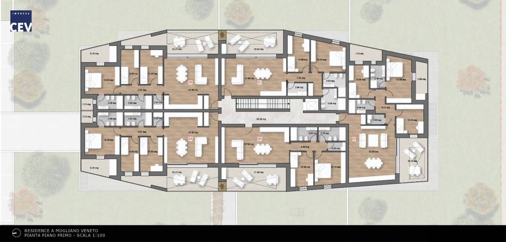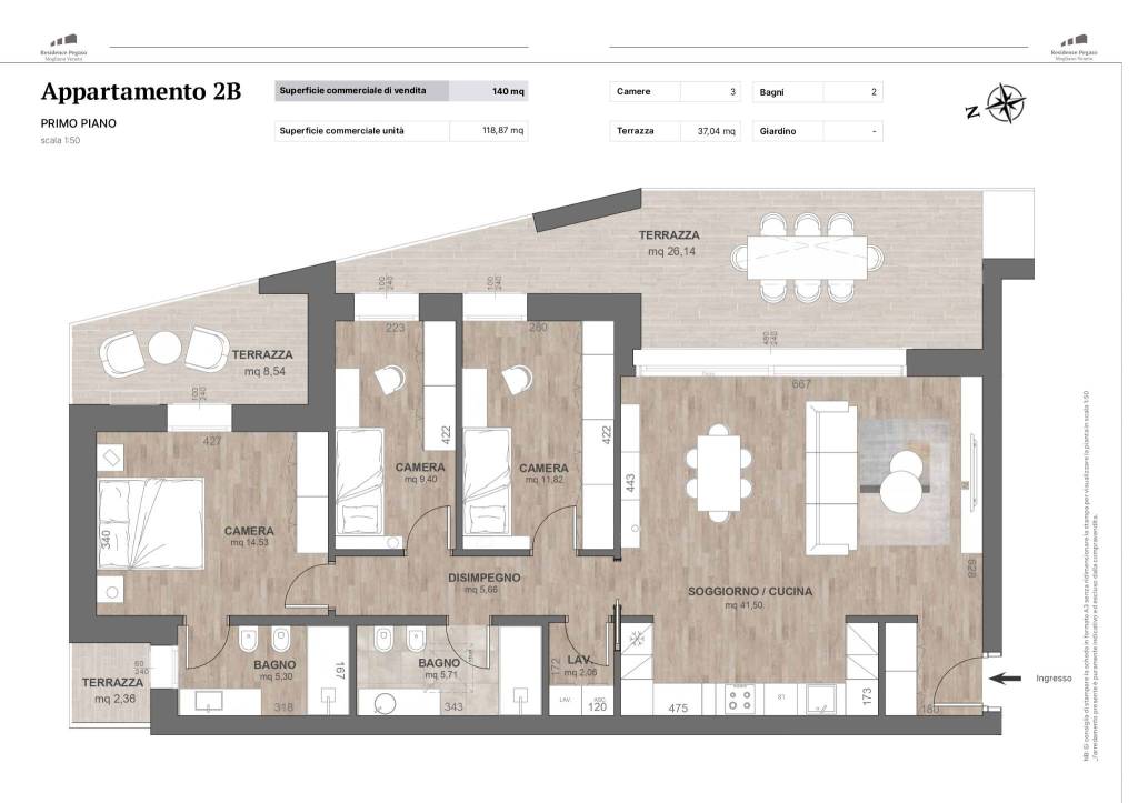 Appartamento tre camere ubicato al piano primo con due bagni, lavanderia e ampia zona giorno/cucina. Tre terrazze esterne da 26-8-3 mq. Nel piano interrato garage doppio e magazzino. Posto auto esterno di proprietà nella zona d'ingresso al condominio.