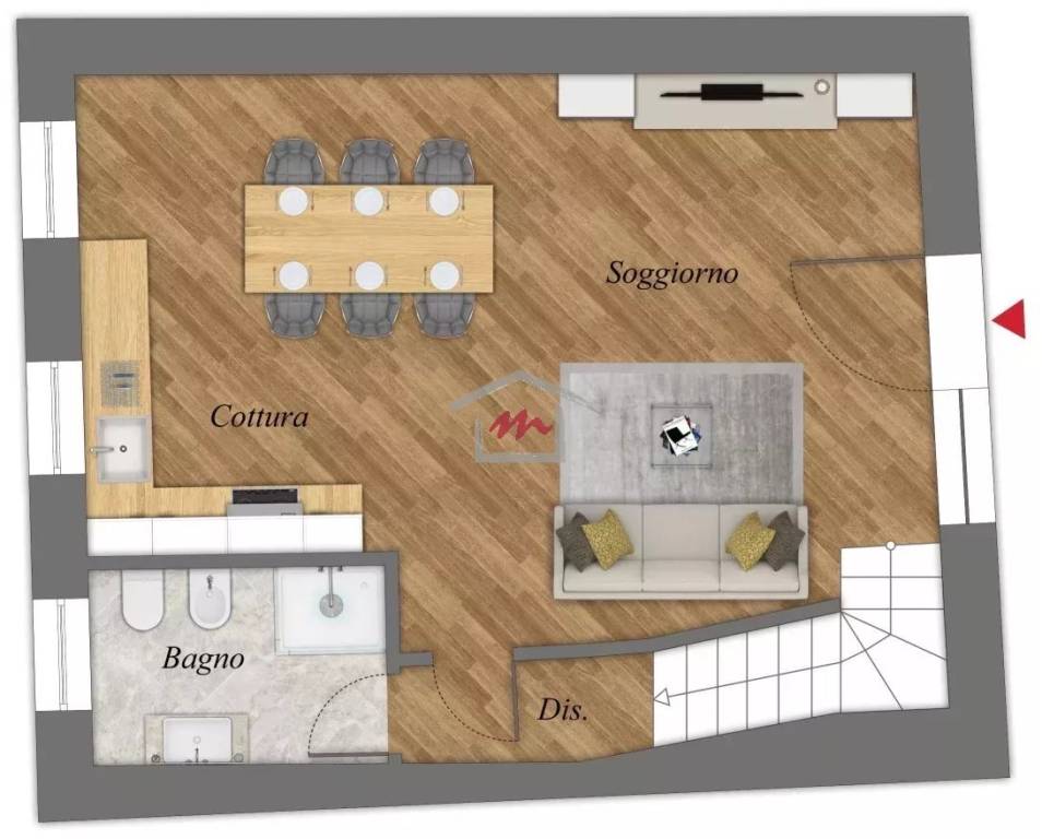In fase di ristrutturazione si può pensare di realizzare al piano interrato la tavernetta, al piano terra l'ampio soggiorno con angolo cottura e servizio, scala interna che collega il piano superiore dove si possono realizzare due camere e servizio.