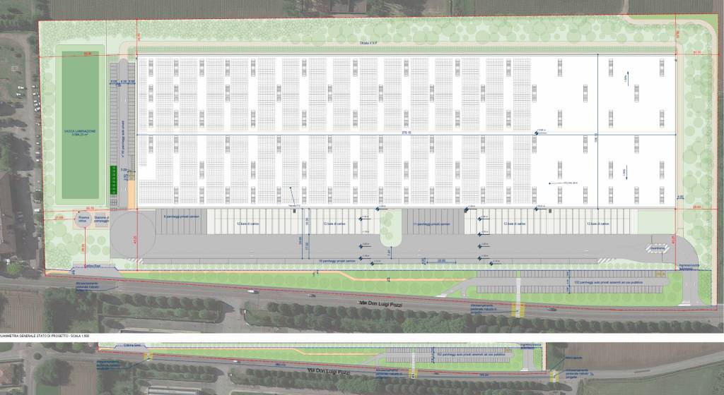 Il magazzino avrà una superficie totale di 41.646 mq, potenzialmente frazionabile e sarà composto da una zona magazzino pari a 41.382 mq e una parte uffici pari a 300 mq.