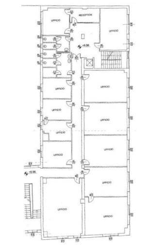 Entrando troviamo la reception, servizi igienici, una piccola area ristoro con cucina e tramite un lungo corridoio abbiamo gli uffici.
