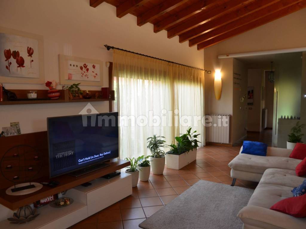 Al piano terra ampio salotto, cucina, pranzo, con doppia uscita su giardino, due camere da letto il tutto con soffitto in travi legno, portico, disbrigo, bagno. completa la zona giorno ampia scala che porta al primo piano, al seminterrato e un garage singolo.