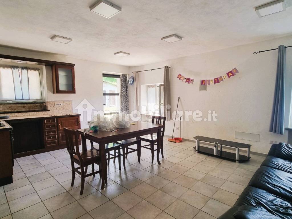 Al piano terreno ingresso in ampio disimpegno, locale cucina, cantinetta/taverna, servizi, cameretta. Al piano superiore due vani al grezzo e predisposizione per bagno, più locale ex fienile ancora sfruttabile. Tetto in ordine. Di fronte ampio garage, magazzino, ripostiglio.