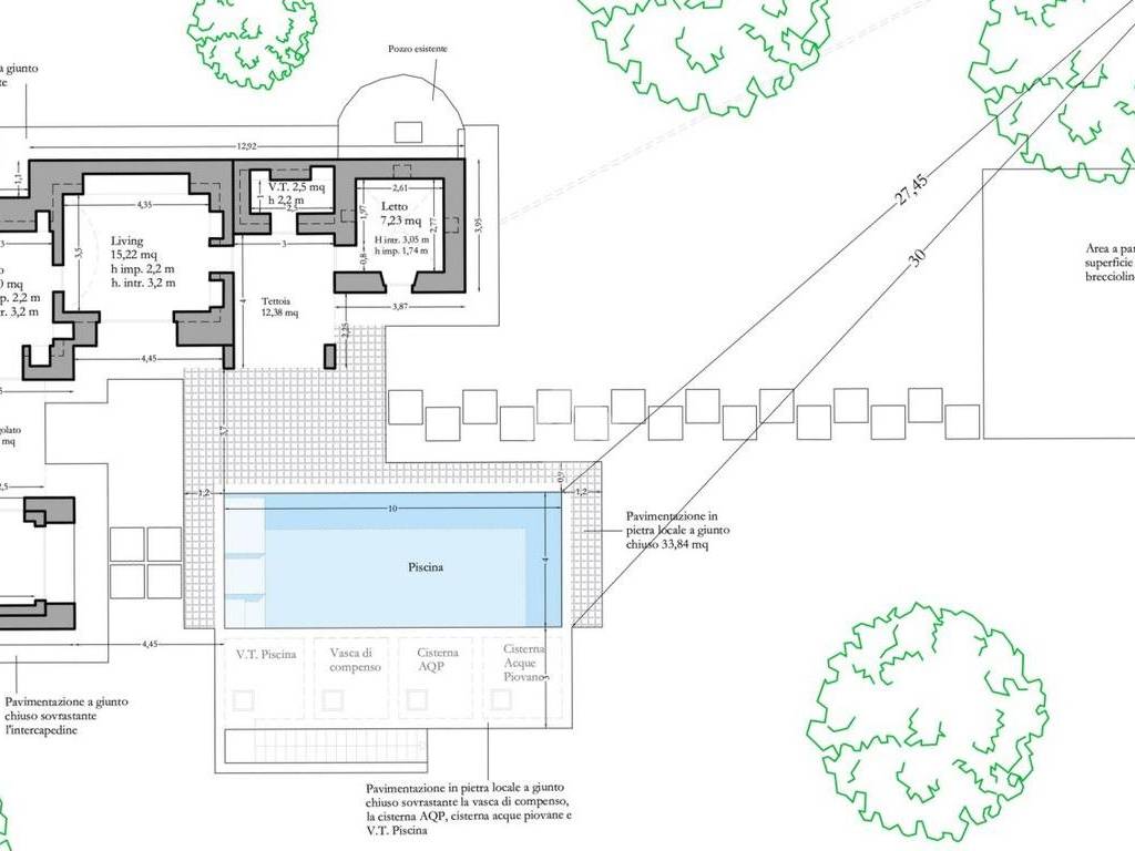 Il progetto prevede una villa di 90mq, e la realizzazione di una piscina di 40mq; un pergolato che collega una rimessa alla matrimoniale, bagno, una zona living di 15mq circa, ed un vano tecnico.