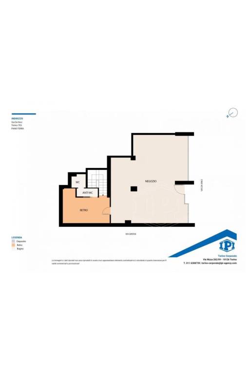 Il locale, dotato di quattro vetrine fronte strada, al piano terreno si presenta con una pianta open space regolare oltre ad uno spazio retrostante dotato di finestre con affaccio sul cortile condominiale. Nella parte retrostante si trova, inoltre, il blocco servizi dotato di anti-bagno con lavello e bagno.