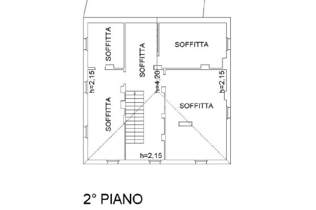 SECONDO PIANO (sottotetto): Dal primo piano poi si sale con una comoda scala in muratura al piano secondo - sottotetto, lasciato al grezzo, suddiviso in 4 locali. Grazie alle altezze veramente elevate, alle finestre basse e allo spazio che ricalca quello effettivamente abitabile dei piani sottostanti; sarebbe tranquillamente possibile ricavare altri spazi abitativi..