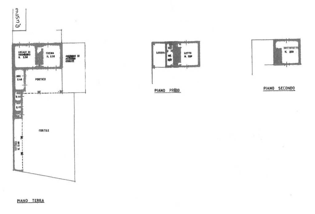 Piano terra: portico, soggiorno, cucinotto oltre camera matrimoniale. Piano primo: camere matrimoniale oltre bagno finestrato. piano secondo: mansarda.