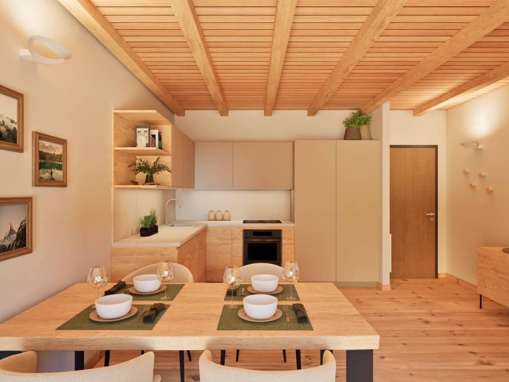 Bilocale con travi a vista, due balconi e posti auto di pertinenza.
