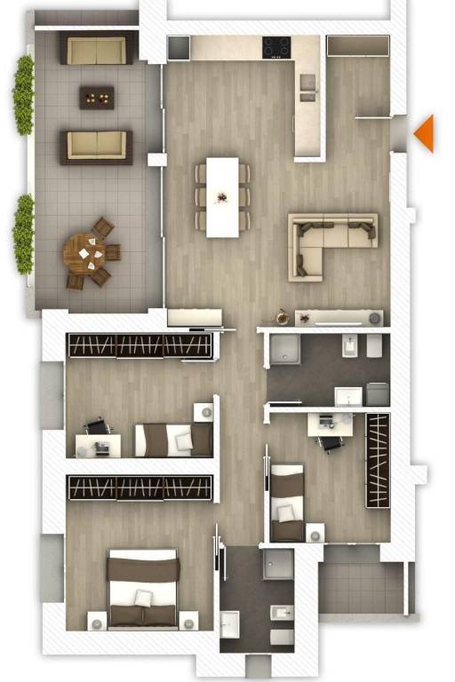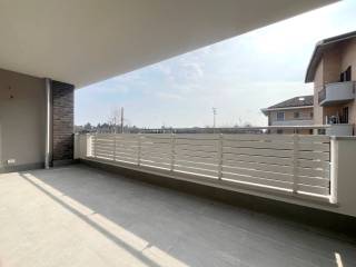 L'appartamento situato al primo piano si compone di un'ampia zona giorno con cucina a vista che permette l'accesso al terrazzo di 20 mq; zona notte composta da camera da letto matrimoniale, due camere singole, doppi servizi e balcone. Completa la proprietà la cantina compresa nel prezzo e la possibilità di acquistare a parte box singolo o doppio.