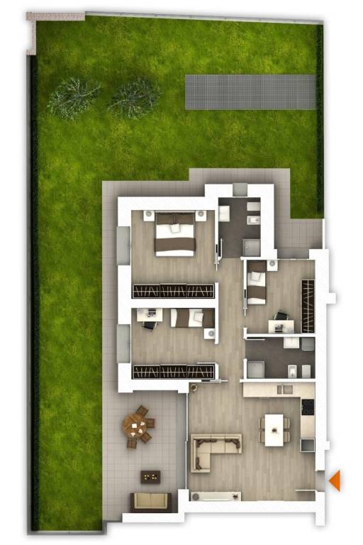 L'appartamento situato al piano terra è composto da soggiorno con cucina a vista che permette l'accesso al porticato coperto di 34 mq e all'ampio giardino privato di 133 mq; zona notte composta da camera da letto matrimoniale, due camere singole e doppi servizi. Completa la proprietà la cantina compresa nel prezzo e la possibilità di acquistare a parte box singolo o doppio.
