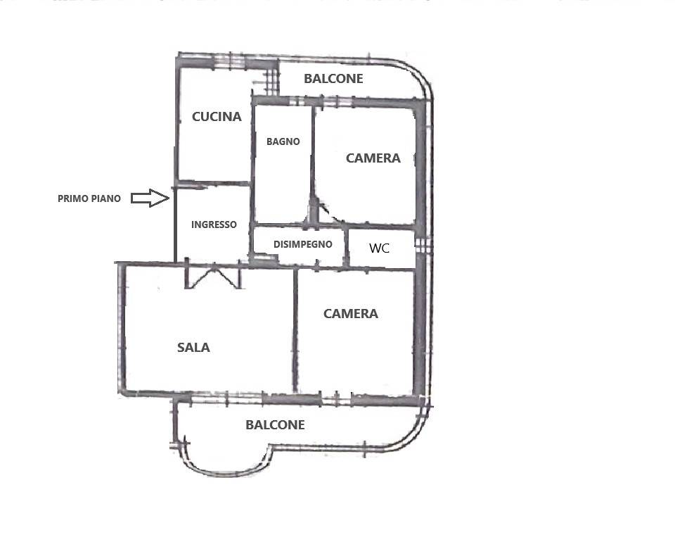 Ingresso, luminosa sala servita da balcone vivibile con affaccio sul giardino condominiale, cucina abitabile con accesso al secondo balcone, due bagni e due camere.