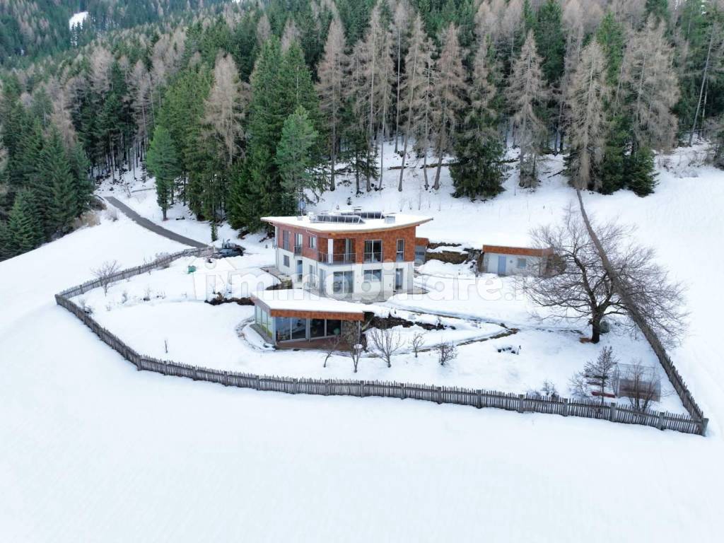 Al piano terra si trova un ampio spazio aperto, che funge da soggiorno, cucina e punto panoramico; sullo stesso livello si trovano anche un luminoso ufficio, una lavanderia e un bagno per gli ospiti. Un vero e proprio colpo d’occhio è la scala rotonda dalle curve dolci e dal design molto elaborato, che costituisce il centro della casa con una stufa in muratura che si estende su due piani, accompagnando la scalinata chiusa parzialmente in vetro, collegando così elegantemente i 3 piani della villa. Il pavimento in quarzite argentea (pietra della Val di Vizze) è posato su tutta la superficie del piano e conferisce agli ambienti un'atmosfera molto prestigiosa.