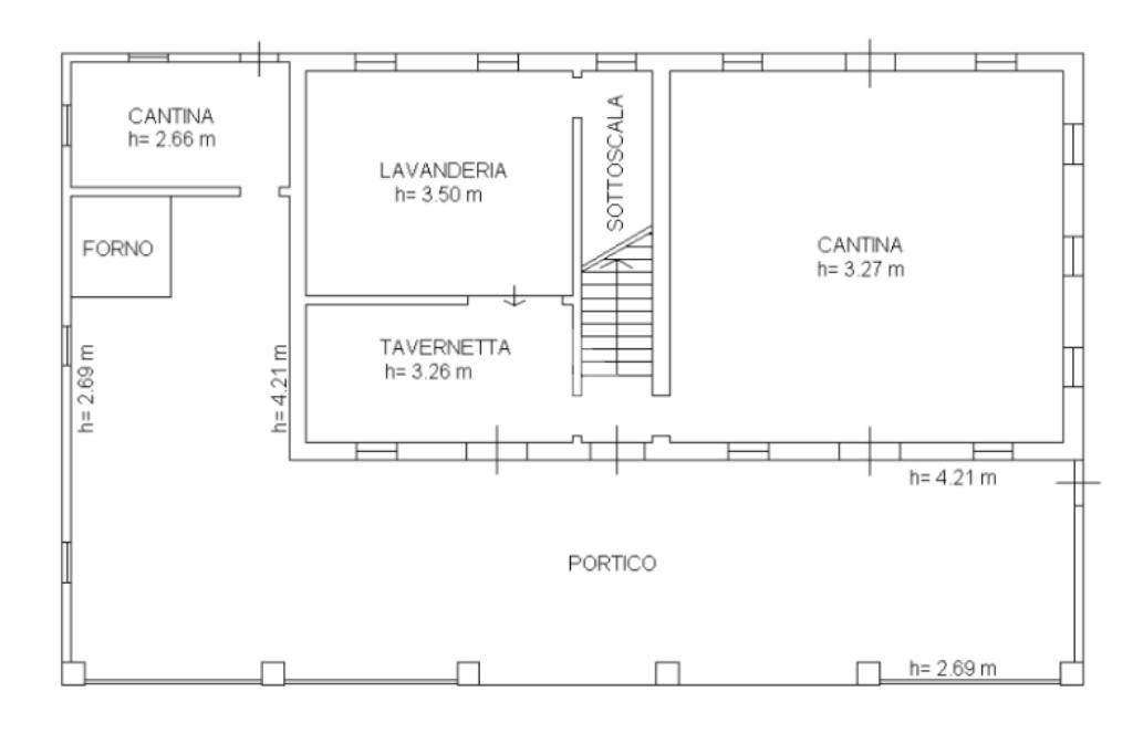 La soluzione è disposta su due livelli: al piano terra troviamo l'accogliente portico che conduce ad un ampia zona servizi divisa in cantine, lavanderia e tavernetta.