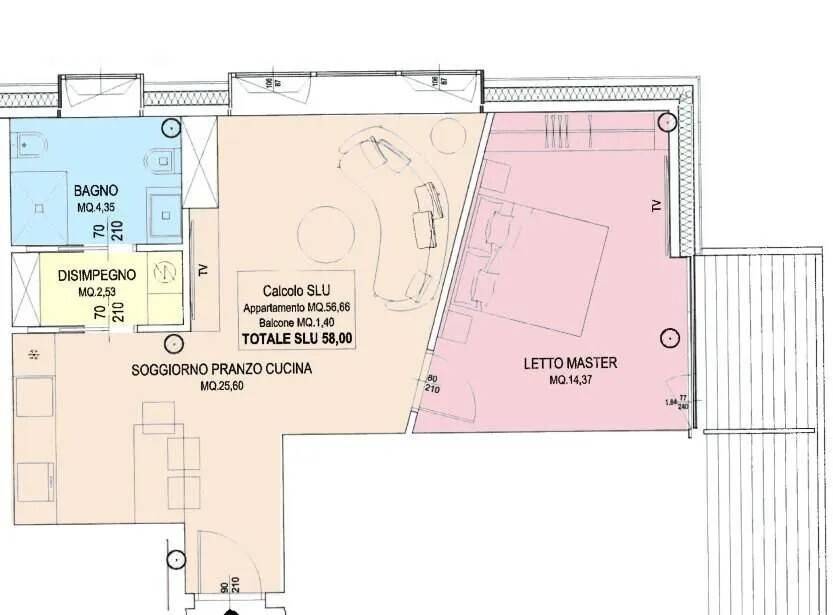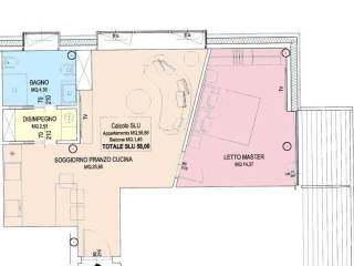 il bilocale di circa 57 mq si compone di Ingresso nella zona giorno con cucina openspace, camera da letto, bagno, ripostiglio e balcone.