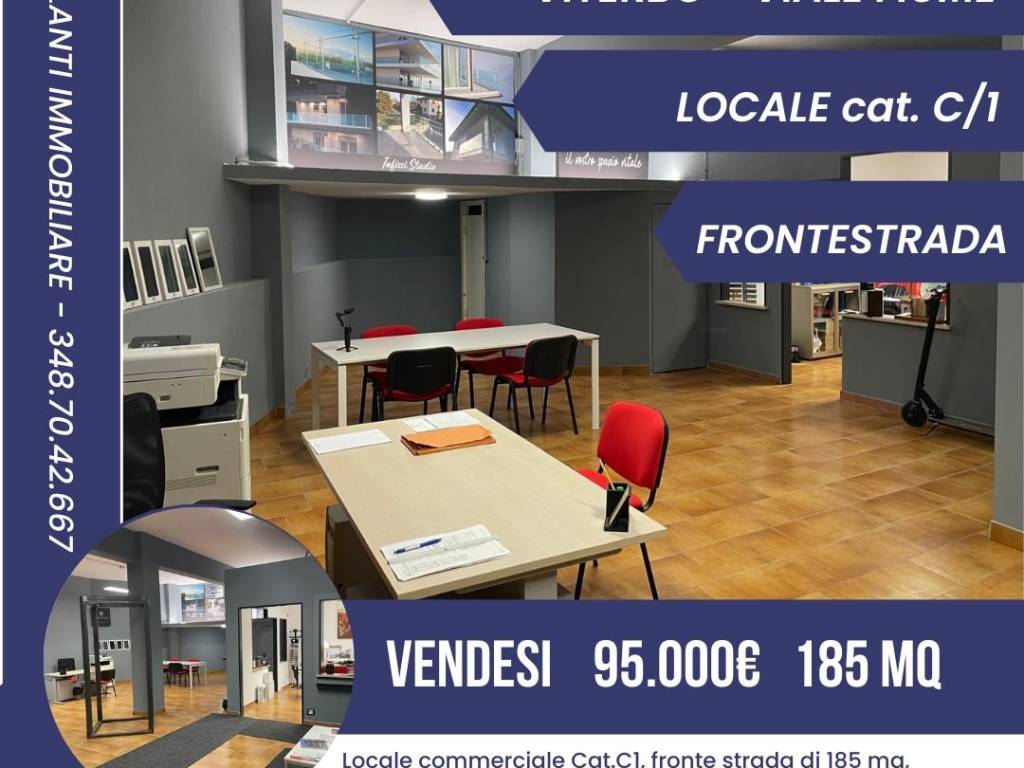 VITERBO - Viale Fiume Locale commerciale Cat.C1, fronte strada di 185 mq, presente doppia vetrina e servizi igienici, attualmente già locato ad un canone mensile di 700€/mese. Per ulteriori informazioni : Umberto AQUILANTI IMMOBILIARE 3487042667