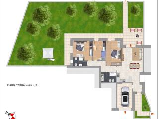 Posto al piano terra lato nord est ha ingresso sul lato ovest con accesso diretto al garage ed al soggiorno cucina, per poi, tramite un disbrigo, passare alla zona notte con lavanderia, un bagno, due camere doppie e la singola posta al centro. Anche questo alloggio ha un giardino sia a ovest sia a nord est dove è provvisto di pompeiana.