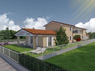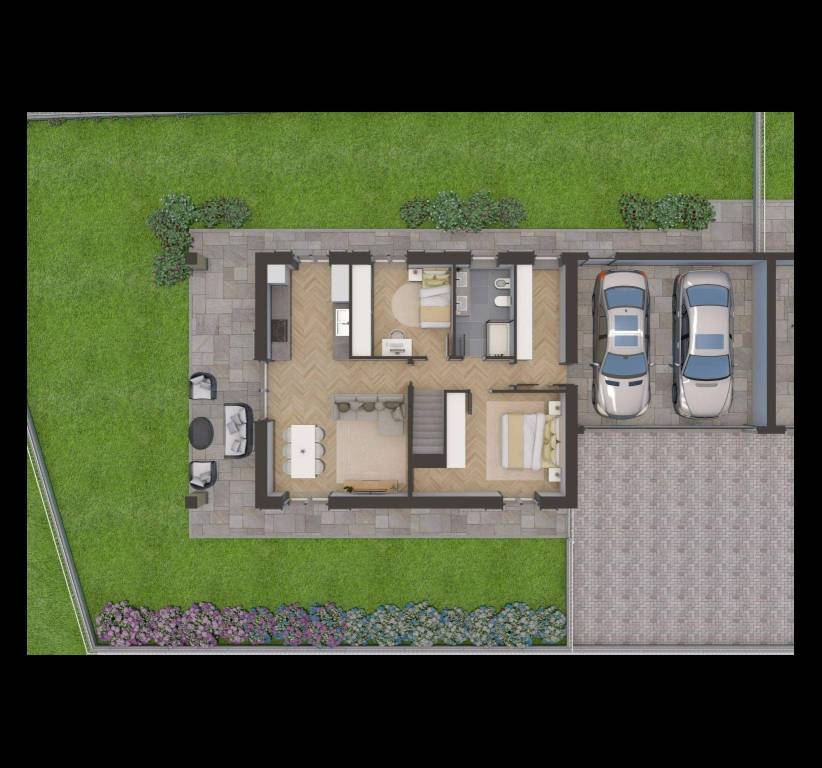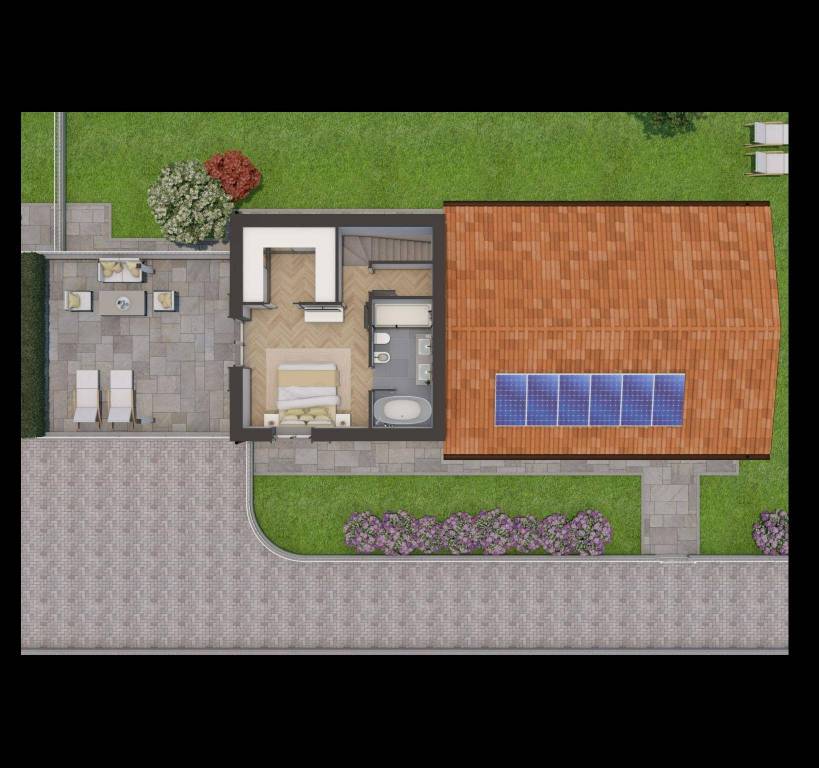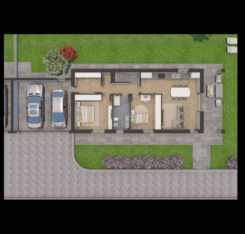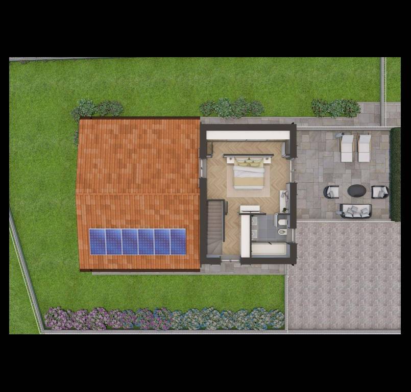 Cucina & Salotto – N°2 camere da letto – N°1 bagno – Locale tecnico / cantina – Doppia autorimessa – Porticato esterno - Giardino privato sui tre lati con ampi spazi verdi