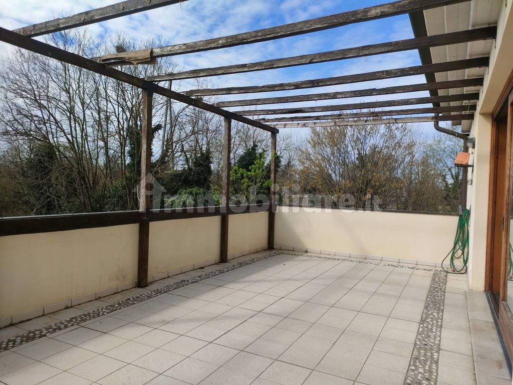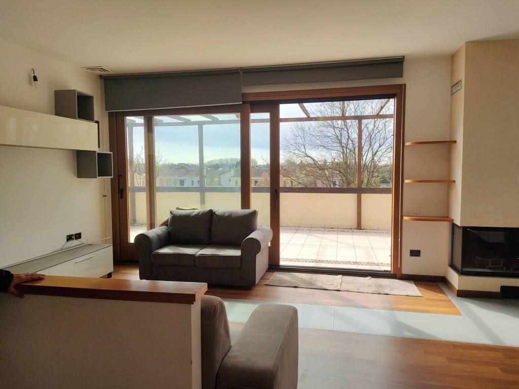 MARIGNANA. Il punto forza di questo appartamento? Essere al secondo e U/P con ascensore con esposizione libera su tre lati (est, sud e ovest) e possedere tre splendide terrazze per un totale di 56 mq. ca. L'abitazione si sviluppa su due livelli. Ampia zona giorno di mq. 34 ca. con caminetto ad aria forzata con grande porta finestra per accedere alla splendida terrazza di 30 mq. dove poter godere momenti in perfetto relax e in perfetta privacy e zona pranzo con adiacente cucina separata ed entrambe con porta finestra per accesso alla terrazza coperta di oltre 12 mq.; zona notte con due camere da letto, la matrimoniale ha una bella terrazza di 12 mq. e bagno con doccia e sanitari sospesi. Dal disimpegno, una comoda scala a chiocciola in legno porta al piano superiore dove insiste un ampio sottotetto/magazzino finestrato lateralmente e lateralmente sfruttato per ottenere armadi contenitori. L'ambiente, riscaldato, è uno spazio con molteplici possibilità di utilizzo e d al piano insiste un comodo bagno completo e finestrato. Le finiture dell'abitazione sono fuori capitolato: porta blindata, infissi interni in legno e vetrocamera, pavimenti in pregiato legno "afromosia" di 1° scelta extra da 22 mm., in cucina pavimento in marmo resina, caminetto in salone. Il riscaldamento è autonomo gas, predisposizione per impianto climatizzazione canalizzata, insiste sistema d'allarme. Completa la proprietà un garage sito al piano seminterrato di mq. 26 ca. Spese condominiali Euro 100,00 mensili ca. salvo conguagli. Cl. En. "E" IPE: 155,20