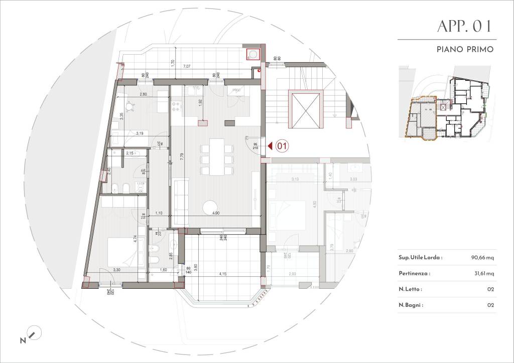 Nascerà al primo piano (Interno A01 p.a. 04), con una superficie di 127 m². L'appartamento dispone di una terrazza e un balcone con orientamento Est e Ovest, perfetti per godersi il sole tutto il giorno.