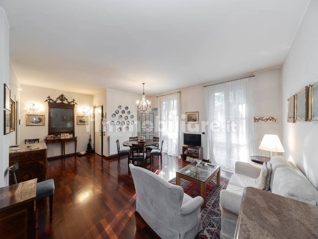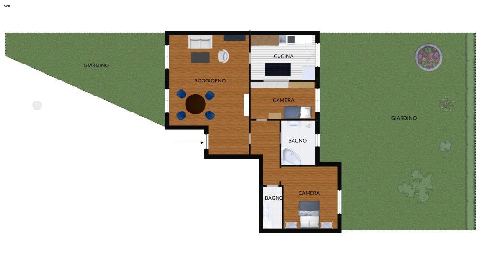 L'immobile si compone di un ampio soggiorno luminoso, con doppia porta finestra che si apre su un primo giardino privato.