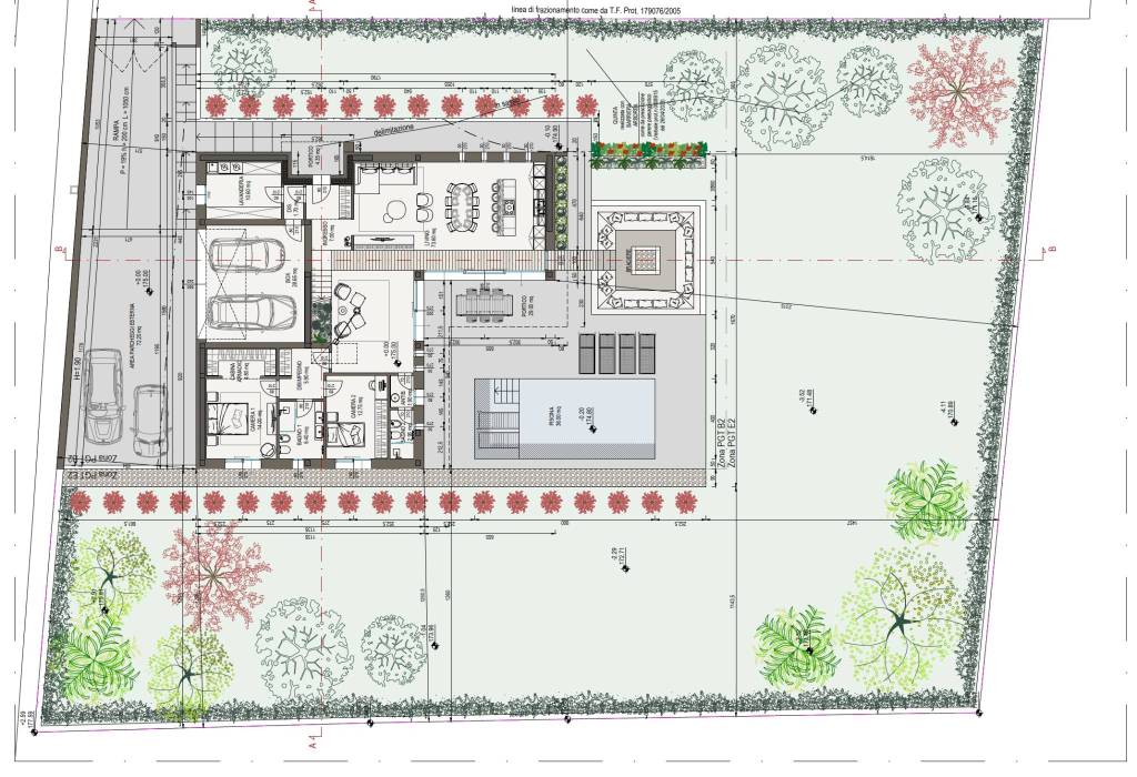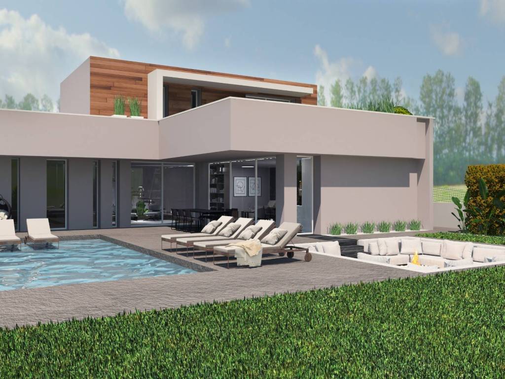 Al piano terra si trova la zona living, ampia e luminosa. Il grande salone accoglie anche cucina e sala da pranzo, perfetto per gli amici o la famiglia. Sullo stesso piano si trovano due camere da letto, due bagni e la lavanderia che conduce alla doppia autorimessa. La scala centrale invece conduce al piano superiore. Il piano terra si affaccia con l’ampio porticato sulla meravigliosa piscina che, circondata dal giardino, regala una notevole privacy. All’esterno troviamo anche la zona relax che crea un'atmosfera particolarmente conviviale.