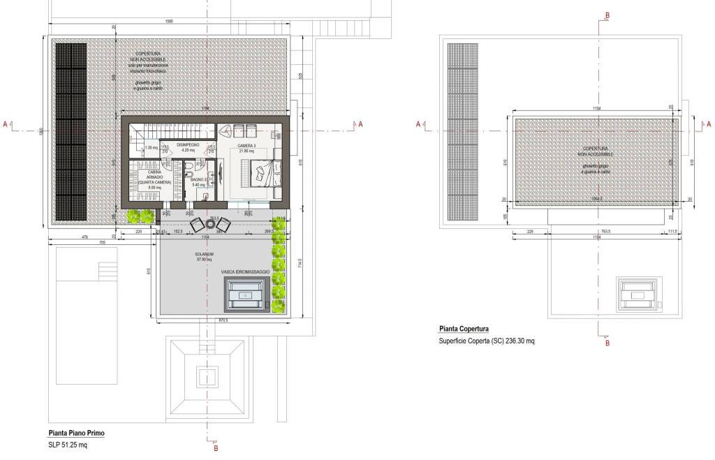 Il piano superiore, arricchito da parquet e travi a vista, ospita la zona notte, composta dalla camera da letto matrimoniale con cabina armadio (eventualmente utilizzabile come quarta camera) e bagno en-suite, con affaccio sul solarium panoramico.