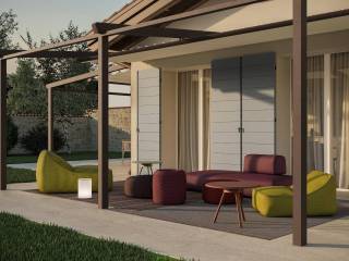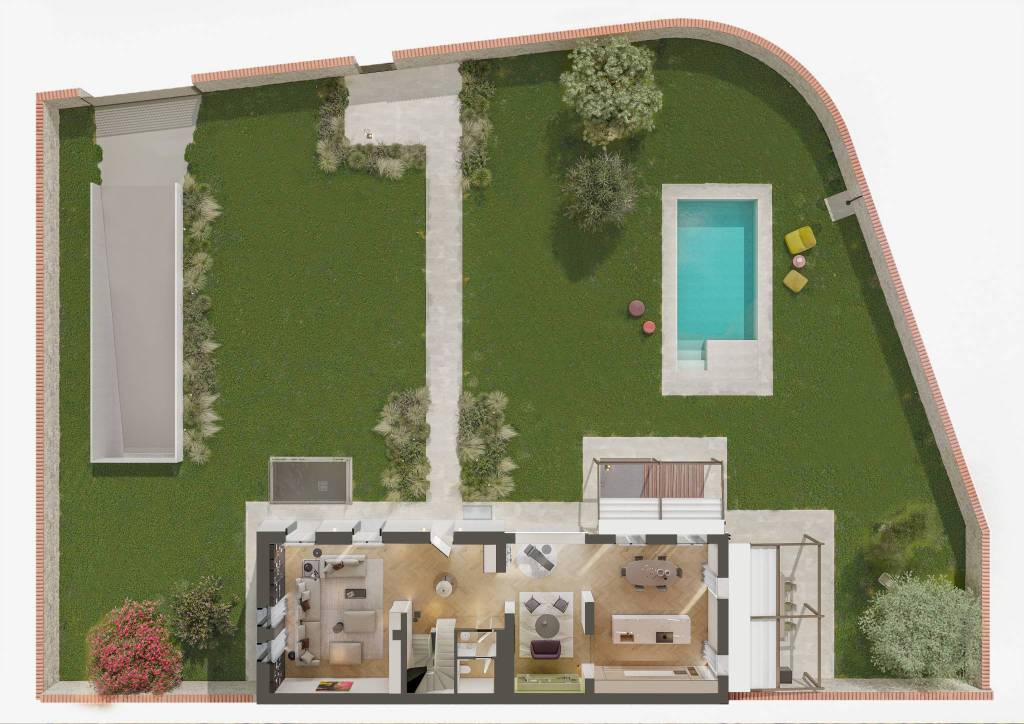 Il piano terra è diviso in due parti, nella prima si trova la zona living, ampia e luminosa e con un'atmosfera calda e conviviale. Dall’altra, il grande salone accoglie cucina e sala da pranzo, perfetto per gli amici o la famiglia. La scala centrale, affiancata dal bagno di servizio, conduce al piano superiore. Il piano terra si affaccia con due ampi pergolati sul meraviglioso giardino che regala una notevole privacy.