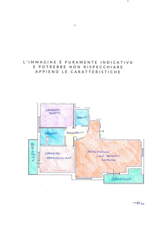 L'Appartamento, 102 mq. circa, è posto al primo piano, composto da: ingresso su soggiorno con angolo cottura, disimpegno, due camere matrimoniali, due bagni con doccia, di cui uno finestrato.