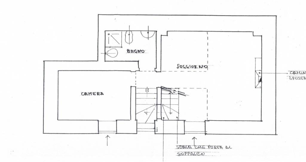 Nell’immaginare i lavori di ristrutturazione, tra le tante soluzioni percorribili, appare intrigante, a giudizio di chi vi scrive, la possibilità di realizzare nella prima sala un soppalco parziale, dai colori tenui, con un pontile che valga a intercettare la scala esterna ad una certa altezza, in modo da avere un accesso alle terrazze dall’interno. Il bagno potrebbe avere una duplice collocazione, a destra o a sinistra del corridoio centrale, trasformando la porta della scala in finestra e la parte residua in un utile ripostiglio. La camera da letto potrebbe trovare dimora nella stanza a seguire, dove la profondità del camino verrebbe sfruttata per raggiungere la giusta misura, spostando il focolare sul muro di fondo del soggiorno. Le terrazze, infine, così graziose nella loro identità, potrebbero fiorire come giardini inattesi, con vasi antichi e piante profumate, a presidio di un pergolato centrale votato alla convivialità, mentre ci si lascia cullare dal cielo stellato, dalle luci fioche della sera, dal sentimento di pace che annulla la fretta e accende la voglia di vivere.