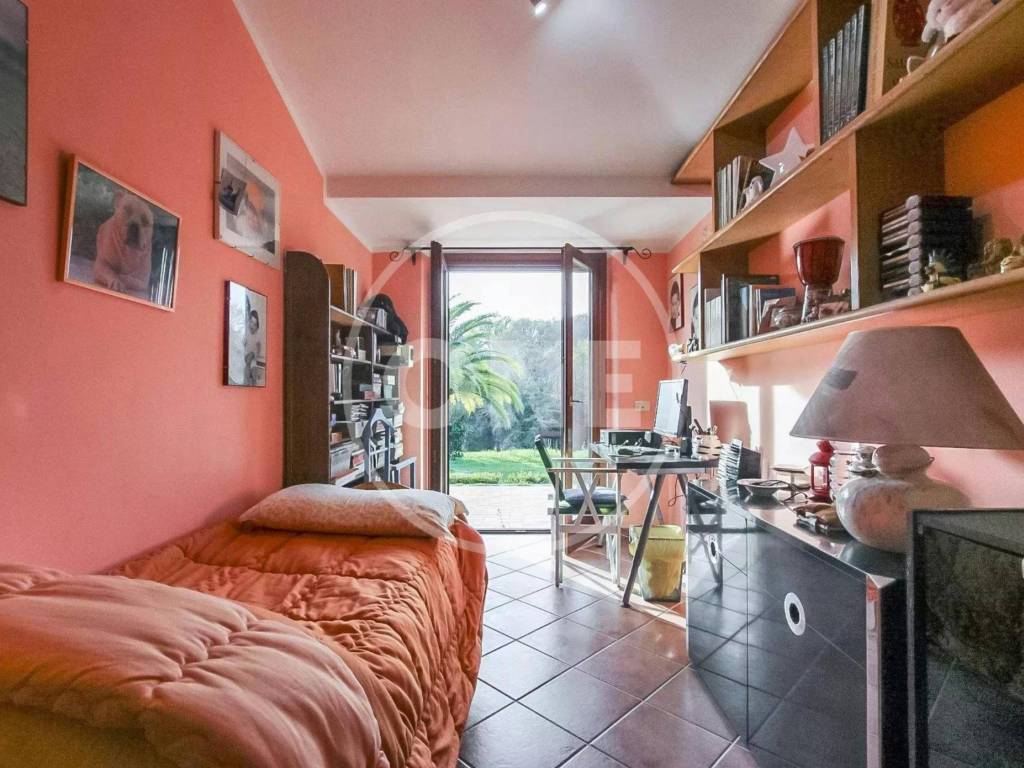 All'interno, la villa svela un ampio salone doppio, inondato di luce naturale grazie alle splendide vetrate che si affacciano sul verde circostante. Il caminetto rappresenta il cuore accogliente del soggiorno, mentre le aperture dirette al giardino offrono un accesso senza soluzione di continuità agli spazi esterni. La cucina, adiacente al salone, è ben attrezzata e comprende una comoda dispensa. La zona notte è composta da tre ampie camere da letto, ciascuna progettata per garantire comfort e privacy, e due eleganti bagni.
