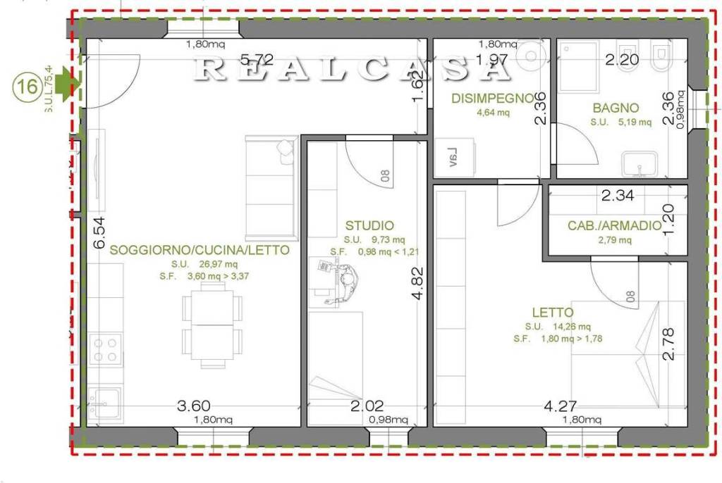 App. 16 - Appartamento al piano primo composto da ampio soggiorno-cucina, una camera con cabina armadio, uno studio, un bagno e un posto auto esterno.
