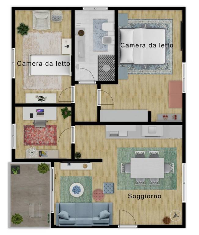 L’immobile, in ottime condizioni, si apre su un luminoso soggiorno con angolo cottura, dal quale si accede a un comodo balcone. Attraverso un funzionale disimpegno si accede alla zona notte, composta da due camere da letto, uno studio e un bagno finestrato.