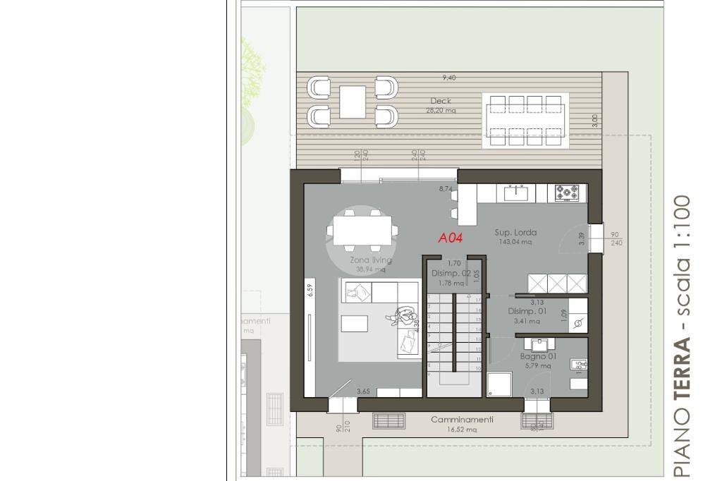 La zona giorno, luminosa e accogliente, comprende un ampio soggiorno con accesso diretto al giardino e una cucina — abitabile o a vista, in base alla configurazione scelta. Completa il piano un comodo bagno di servizio. All’esterno, un portico coperto affacciato sul giardino offre uno spazio perfetto per pranzi all’aperto o momenti di relax.