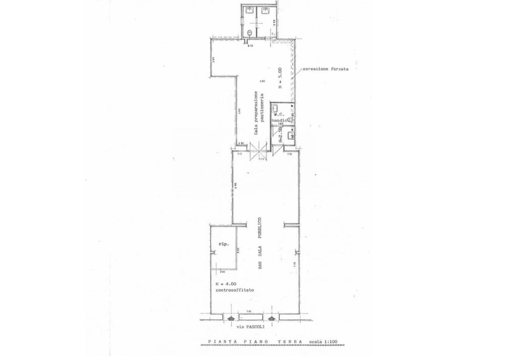 L'ingresso apre su una spaziosa area accogliente, un tempo adibita a bar, caratterizzata da una controsoffittatura decorativa che ne arricchisce l'atmosfera. Una porta separa questa zona da un ambiente più riservato, utilizzato in origine come laboratorio artigianale o pasticceria, funzionale e ben distribuito. Completano la dotazione due servizi distinti: un bagno con antibagno dedicato alla clientela, posto nella parte anteriore del locale, e un secondo bagno con antibagno ad uso esclusivo del personale, collocato nella zona retrostante.