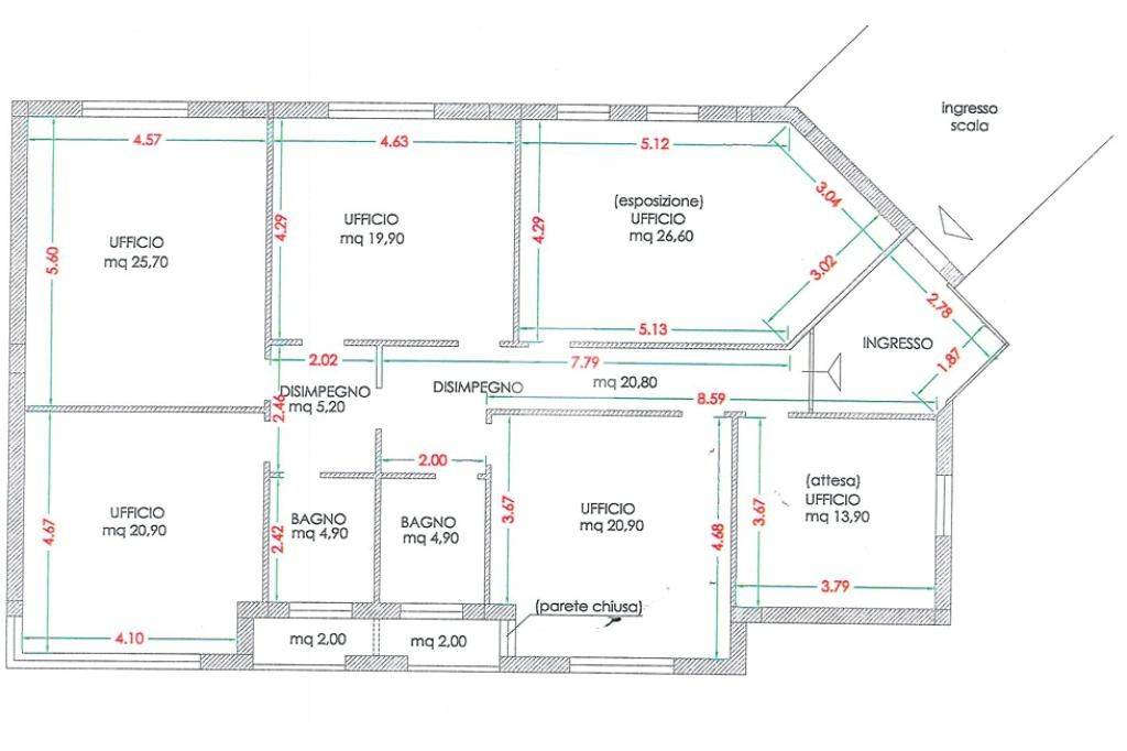 L'ufficio, situato al secondo ed ultimo piano, è così suddiviso: sei ampi ambienti ad uso ufficio, corridoio, disimpegno, due servizi e balcone.