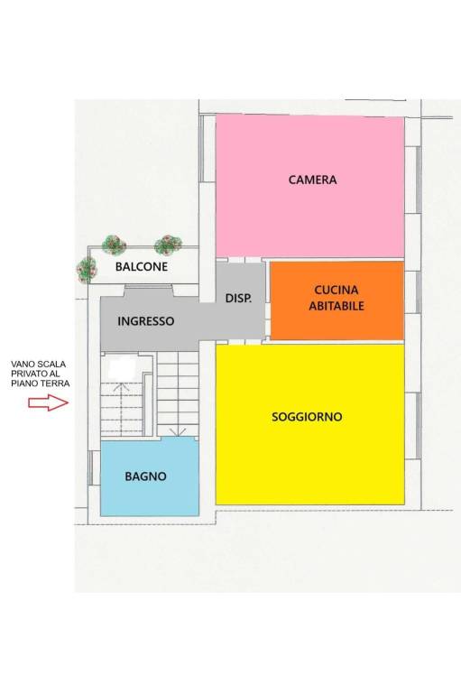 L’abitazione dispone di ingresso indipendente da piano terra dotato di uno spazioso disimpegno che ospita la scala privata che conduce all’appartamento al piano primo composto da un comodo ingresso, un soggiorno, una cucina in ambiente separato, una camera matrimoniale, un bagno ed un balcone. A scelta possibilità di soggiorno con cucina a vista e studio in ambiente separato.