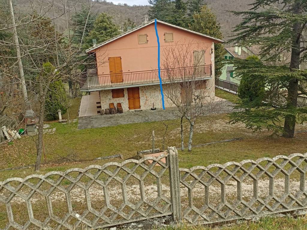 Sarnano (MC) in Contrada Btilli sulla strada che porta alla stazione sciistica di Sassotetto, porzione di villa bifamiliare edificata negli anni 2000 si sviluppa su tre livelli più soffitta e si compone di : al piano terra soggiorno con camino, cucina abitabile, bagno e balcone; al paino primo troviamo 3 camere, due bagni e balconi; al piano seminterrato troviamo ampio locale destinato a vari usi, cantina e bagno. Giardino circostante. Le utenze sono individuali.