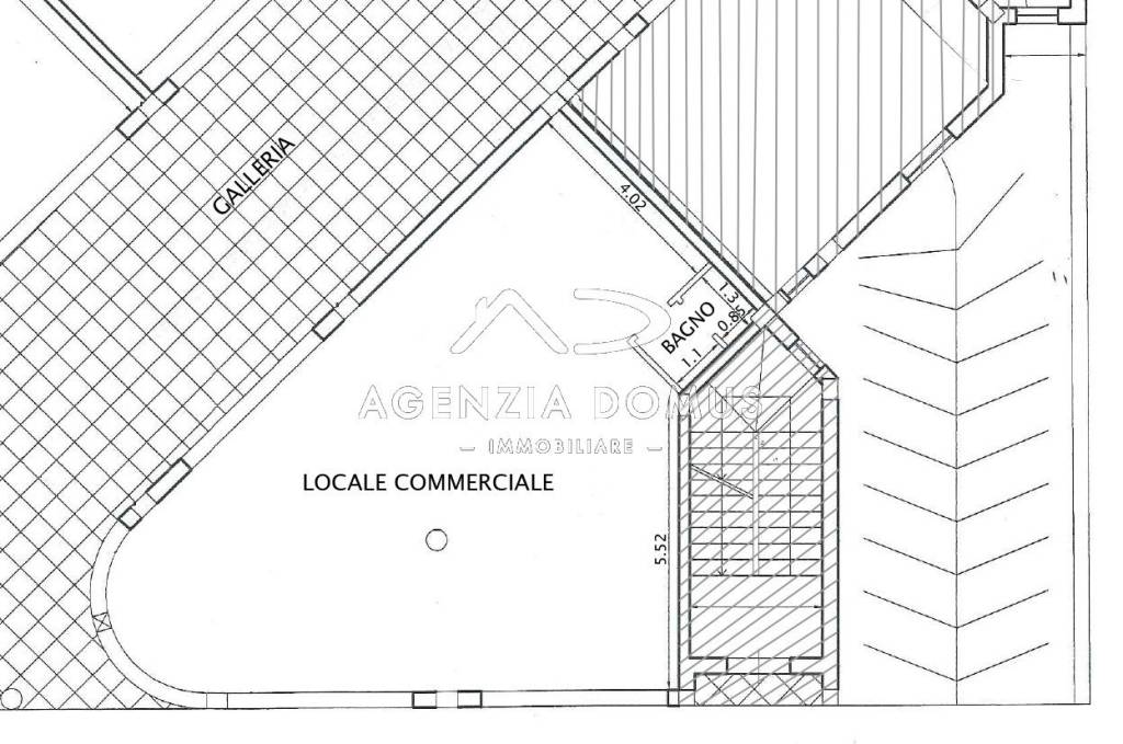 L'immobile, di recente costruzione (2005), si compone di un unico ambiente con servizio igienico, con quattro vetrine esposte per la maggior parte su strada. L'edificio fa parte di un complesso edilizio e ha come pertinenza un piccolo spazio adibito a galleria, destinato ad uso pubblico per il transito pedonale.