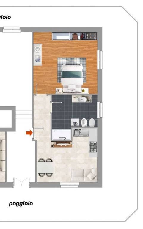 Bilocale in ottima posizione con esposizione a sud, ovest, est ed ampio poggiolo. L' appartamento è costituito da un ingresso indipendente comune solo ad altra unità abitativa, un disimpegno, un soggiorno con cottura, un bagno, un'ampia camera matrimoniale ed un spazioso e bene esposto poggiolo. La dimora è già abitabile sebbene una rivisitazione lo potrebbe migliorare ed ottimizzare. Vicinissimo al fabbricato troviamo un ampio parcheggio gratuito e con facile accessibilità.