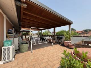SOLUZIONE UNICA NEL SUO GENERE!!! in palazzina anni 80 ben tenuta e contornata da giardino condominiale, posto al secondo ed ultimo piano senza ascensore, splendido ATTICO su unico livello, composto da ampia zona di ingresso, salone doppio con stufa a pellet, cucina abitabile, disimpegno notte con due camere e doppi servizi, oltre ad ampia zona soppalcata sul salone ideale come zona hobby/studio. Da tutti i locali si accede al TERRAZZO di circa 100 mq che gira sui 3 lati della casa con una ampia zona coperta da pergolato in legno antistante la cucina. completano la proprietà un vano cantina ed un box doppio in lunghezza con prezzo a parte. riscaldamento autonomo con caldaia a condensazione, serramenti nuovi in pvc triplo vetro e persiane in alluminio nuove, climatizzato, stufa a pellet.