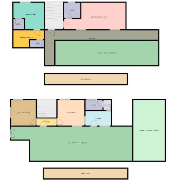 Al piano terra troviamo l'ampio e luminoso soggiorno separato dalla cucina abitabile ed il bagno di servizio finestrato con doccia. La zona giorno è completata da un comodo locale pluriuso.