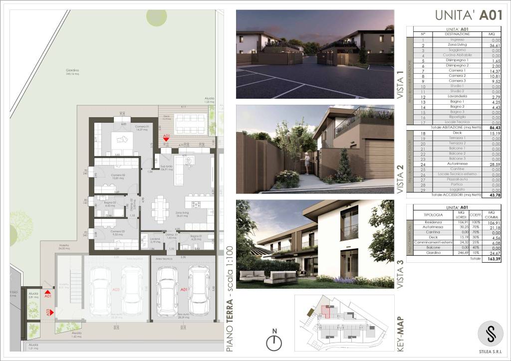 L’unità abitativa qui proposta, si sviluppa su un unico livello al piano terra ed è libera su tre lati. E’ composta da ampio e luminoso soggiorno con cucina a vista dotati di grandi vetrate che ci portano al riservato deck esterno, disimpegno che collega l’immobile direttamente al comodo box doppio in larghezza, bagno e lavanderia. La zona notte, accessibile tramite comodo disimpegno, ci conduce alle due camere da letto singole ed al bagno. La camera matrimoniale invece, ha accesso diretto dalla zona giorno. Completa il tutto il meraviglioso giardino con area pavimentata dove poter ubicare la tua piscina da 6 metri x 3. Possibilità di variare la distribuzione degli spazi interni seguiti dai nostri architetti. Classe energetica A 4, valore di progetto in fase di attribuzione.