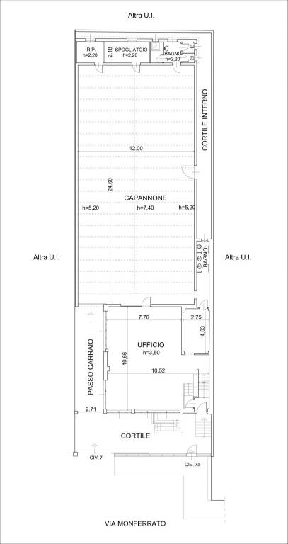 - Piano interrato: locale ad uso ad uso deposito/magazzino di mq. 130 circa aventi altezza di mt. 2.40 collegati mediante scala interna agli uffici al piano terra e mediante scala esterna al cortile interno al piano terra;