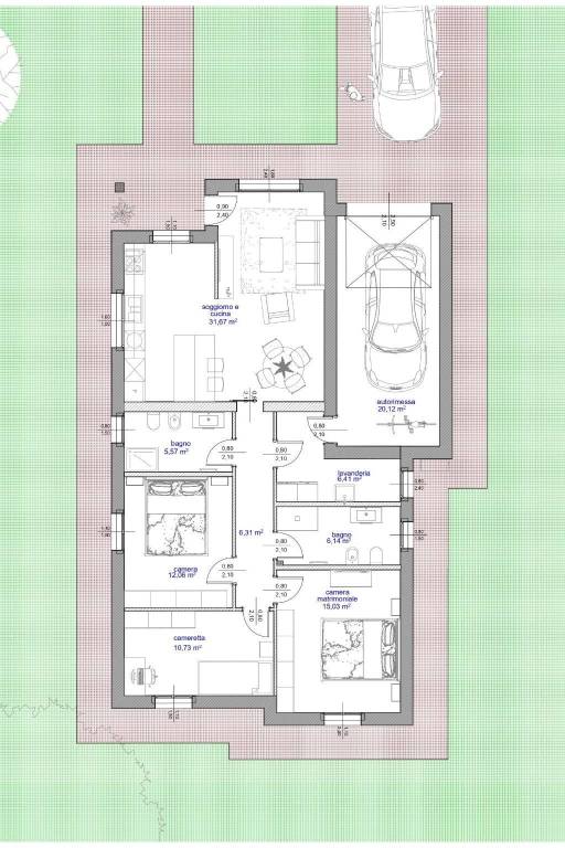 La villa è così composta: un ampio soggiorno con cucina a vista di circa 32 mq, due camere matrimoniali di 15 e 13 mq, terza camera da 11 mq, doppi servizi completi ed entrambi finestrati, lavanderia separata e un box direttamente collegato di 20 mq sempre al piano terra.