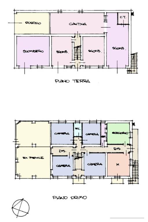 Al piano terra troviamo invece una cantina, quattro vasti locali di sgombero, la centrale termica e un box auto.